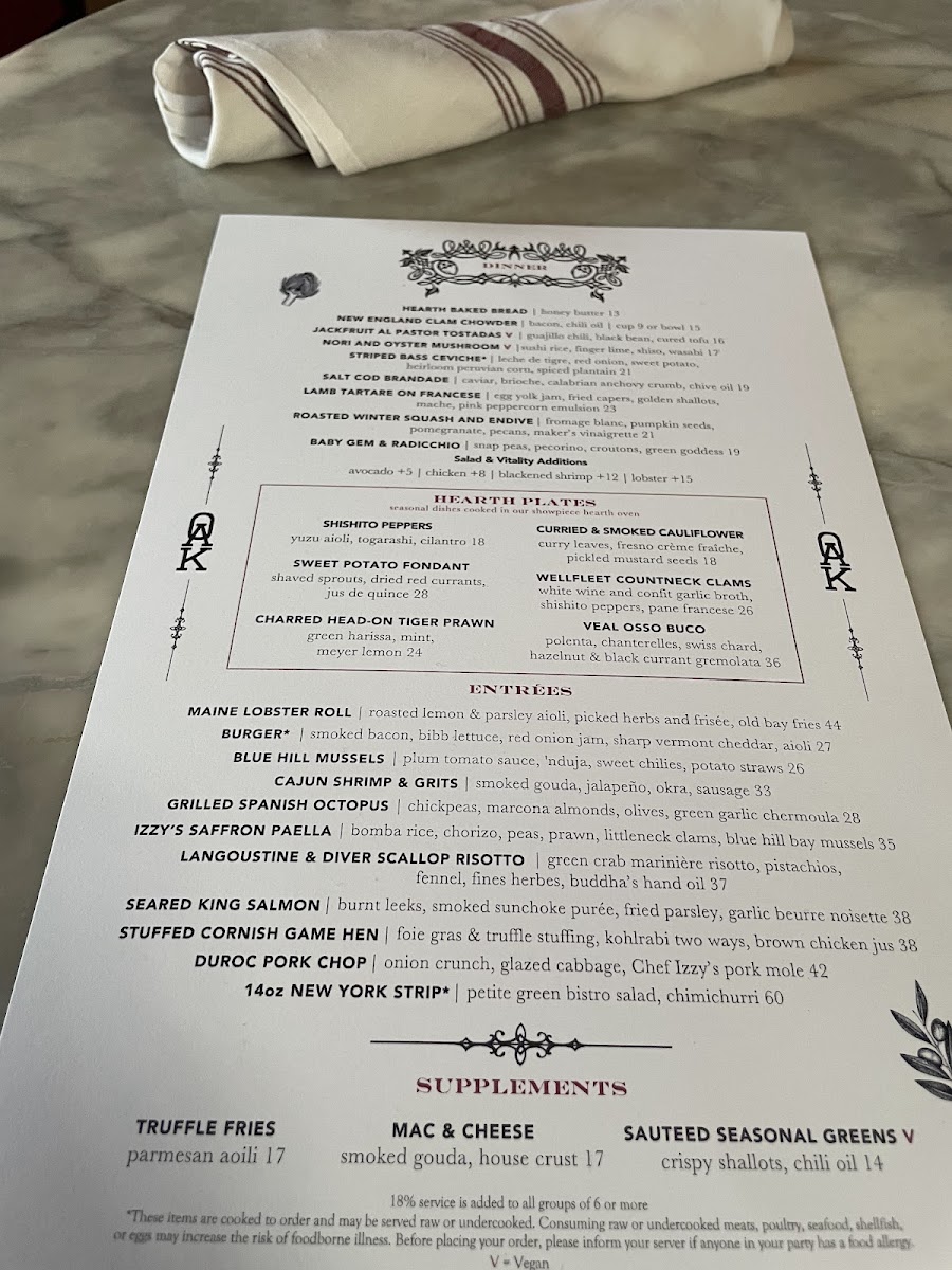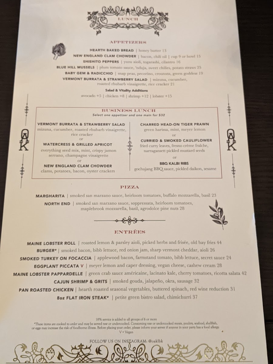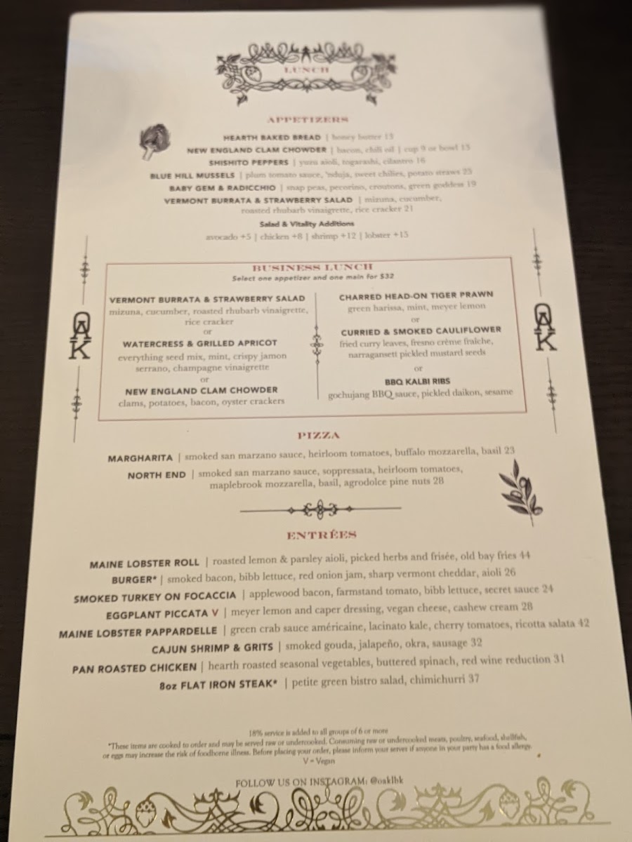 Step into Oak Long Bar & Kitchen, where each dish on the Oak Long Bar Kitchen Menu offers a delightful mix of classic comfort and modern flavors. Located in the heart of Boston, this inviting spot takes pride in its carefully crafted menu, designed to satisfy a variety of tastes. Whether you’re here for a casual bite or a more sophisticated meal, their selection of seafood, steaks, and seasonal dishes ensures there's something for everyone. Each plate is prepared with fresh ingredients and attention to detail, making for a memorable dining experience. Complement your meal with one of their signature cocktails or an expertly chosen wine from their extensive list, and let Oak Long Bar & Kitchen be your go-to place for great food and warm hospitality.