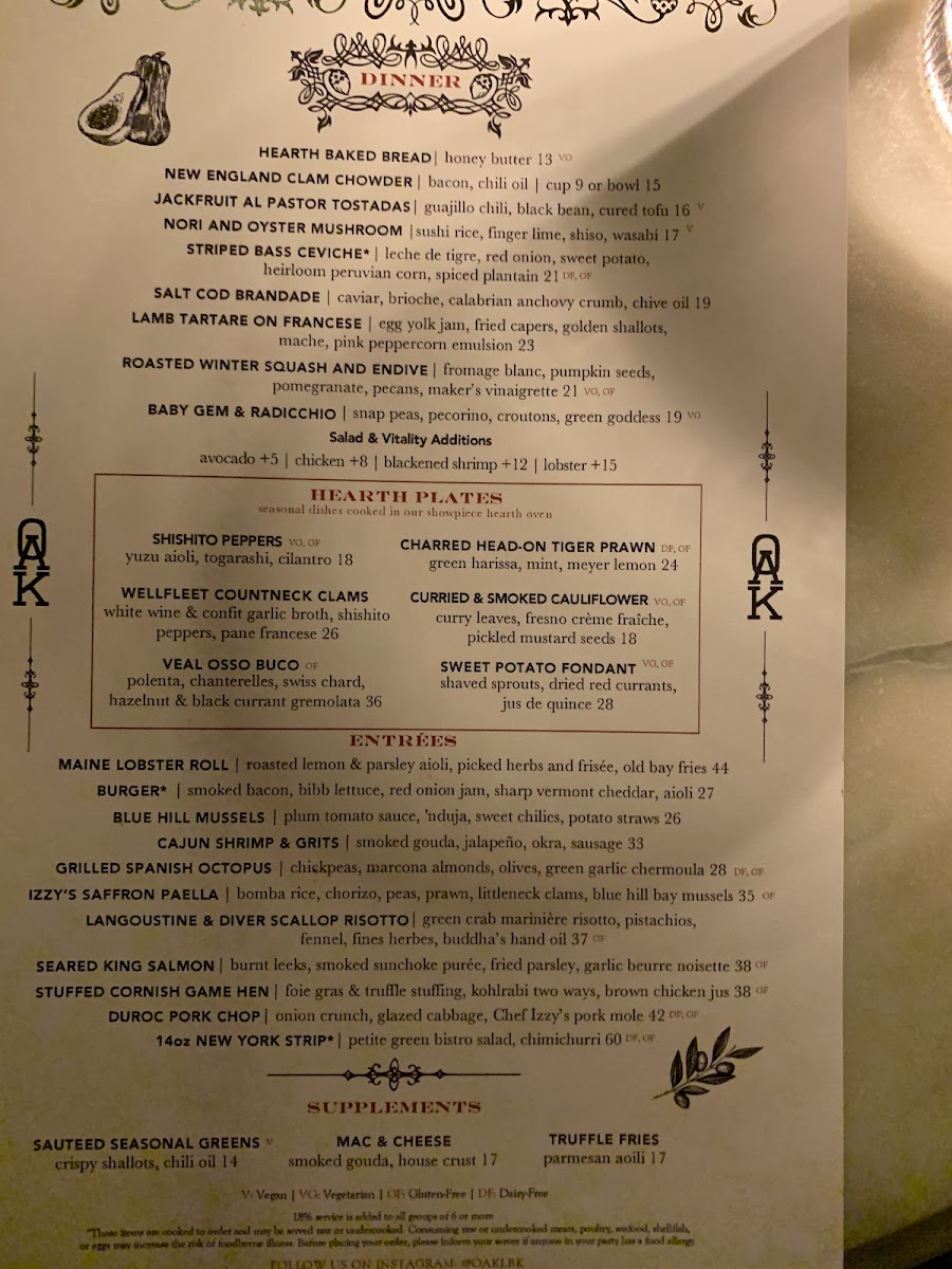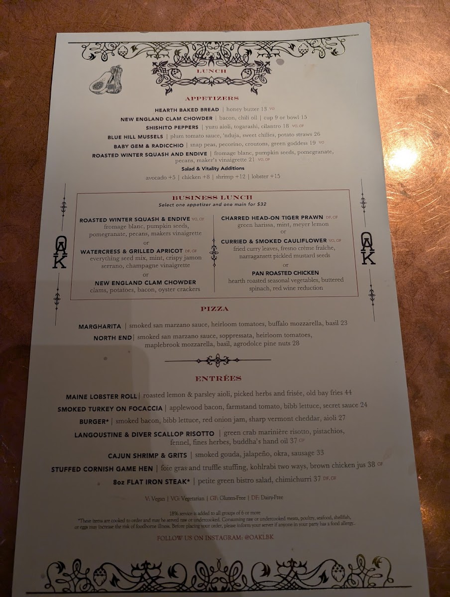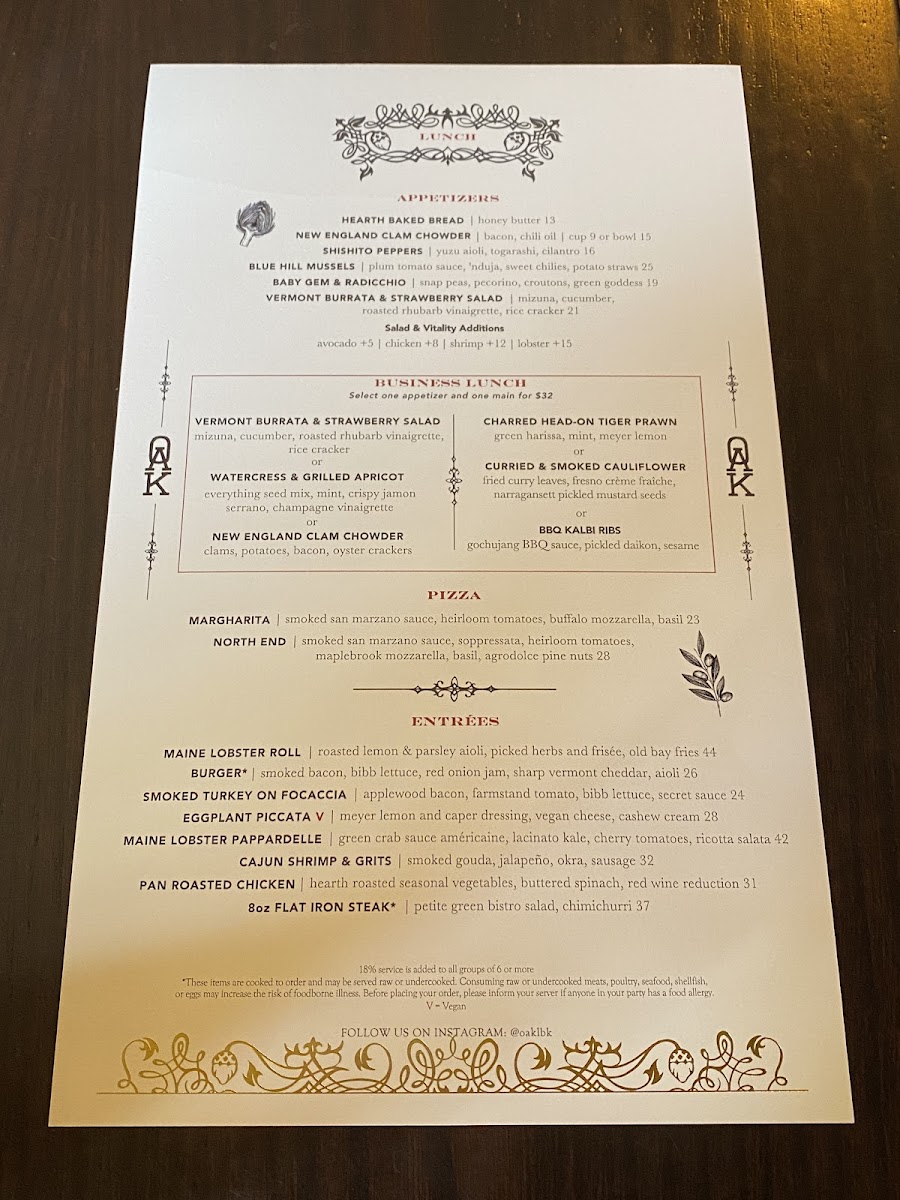 Step into Oak Long Bar & Kitchen, where each dish on the Oak Long Bar Kitchen Menu offers a delightful mix of classic comfort and modern flavors. Located in the heart of Boston, this inviting spot takes pride in its carefully crafted menu, designed to satisfy a variety of tastes. Whether you’re here for a casual bite or a more sophisticated meal, their selection of seafood, steaks, and seasonal dishes ensures there's something for everyone. Each plate is prepared with fresh ingredients and attention to detail, making for a memorable dining experience. Complement your meal with one of their signature cocktails or an expertly chosen wine from their extensive list, and let Oak Long Bar & Kitchen be your go-to place for great food and warm hospitality.